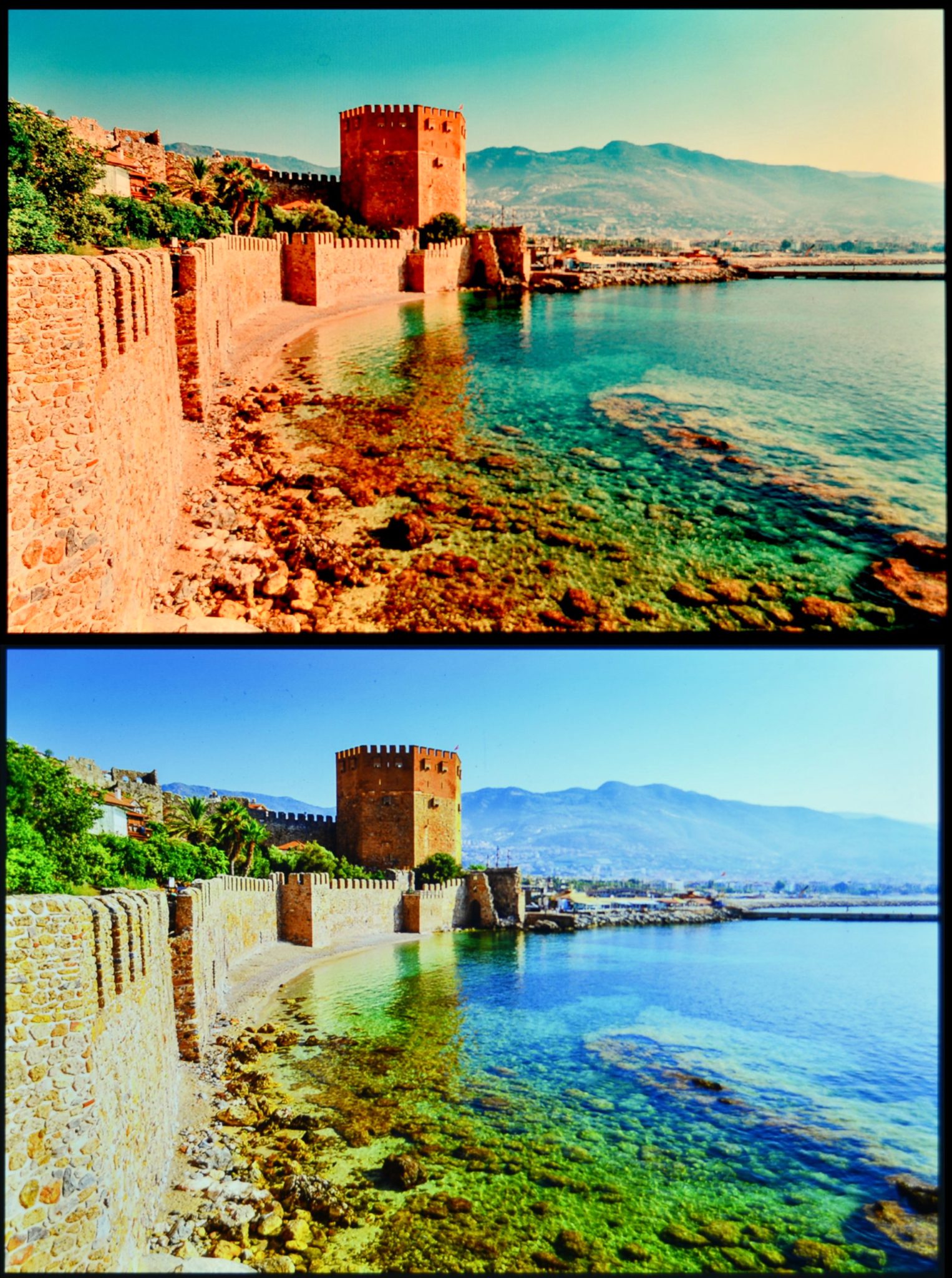 Ordinary electro-luminescent picture at camera white point from bottom 2500K, 6250K, 10,000K.