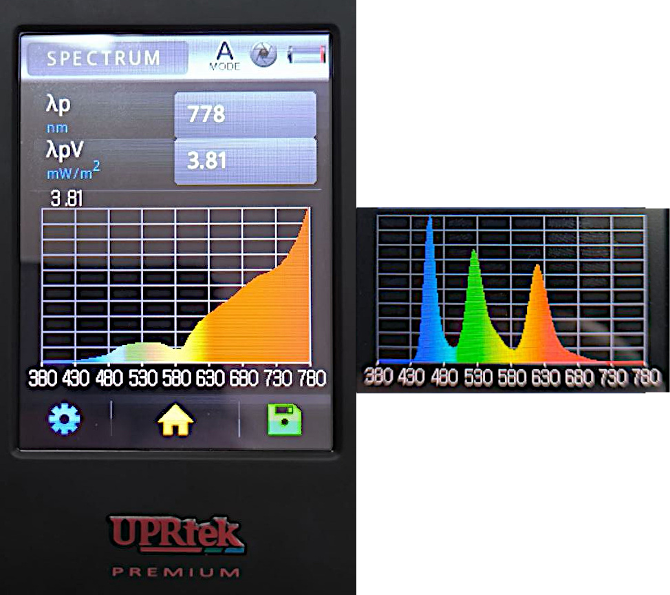 SpectrumView electro-incandescent backlight spectrum vs separate RGB style luminescent backlight spectrum, in wavelength (nm).